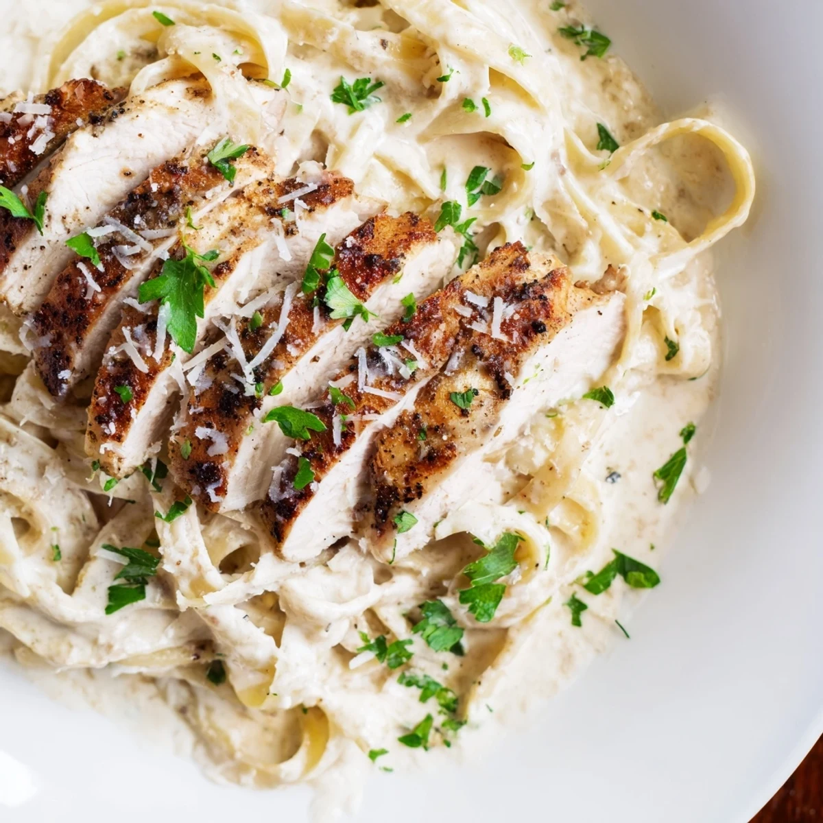 - Serve the pasta topped with sliced blackened chicken then finish with chopped parsley and an extra shower of Parmesan cheese