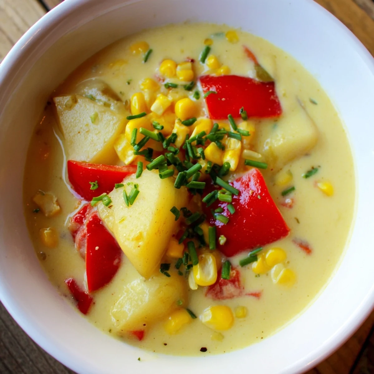 This comforting chowder is a warm blend of sweet corn kernels, diced Yukon Gold potatoes, and vibrant red bell peppers. Sautéed onions, celery, and garlic add depth while smoked paprika and thyme provide gentle warmth. Partially blended for a creamy texture with tender chunks remaining, it’s enriched with milk and heavy cream for extra silkiness. Garnished with fresh chives, it’s perfect served hot for a nourishing, vegetarian-friendly bowl.