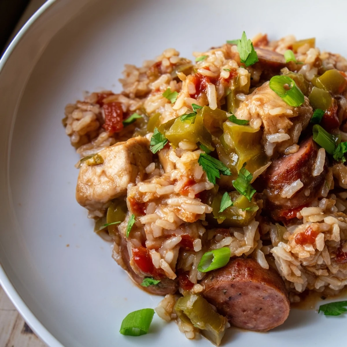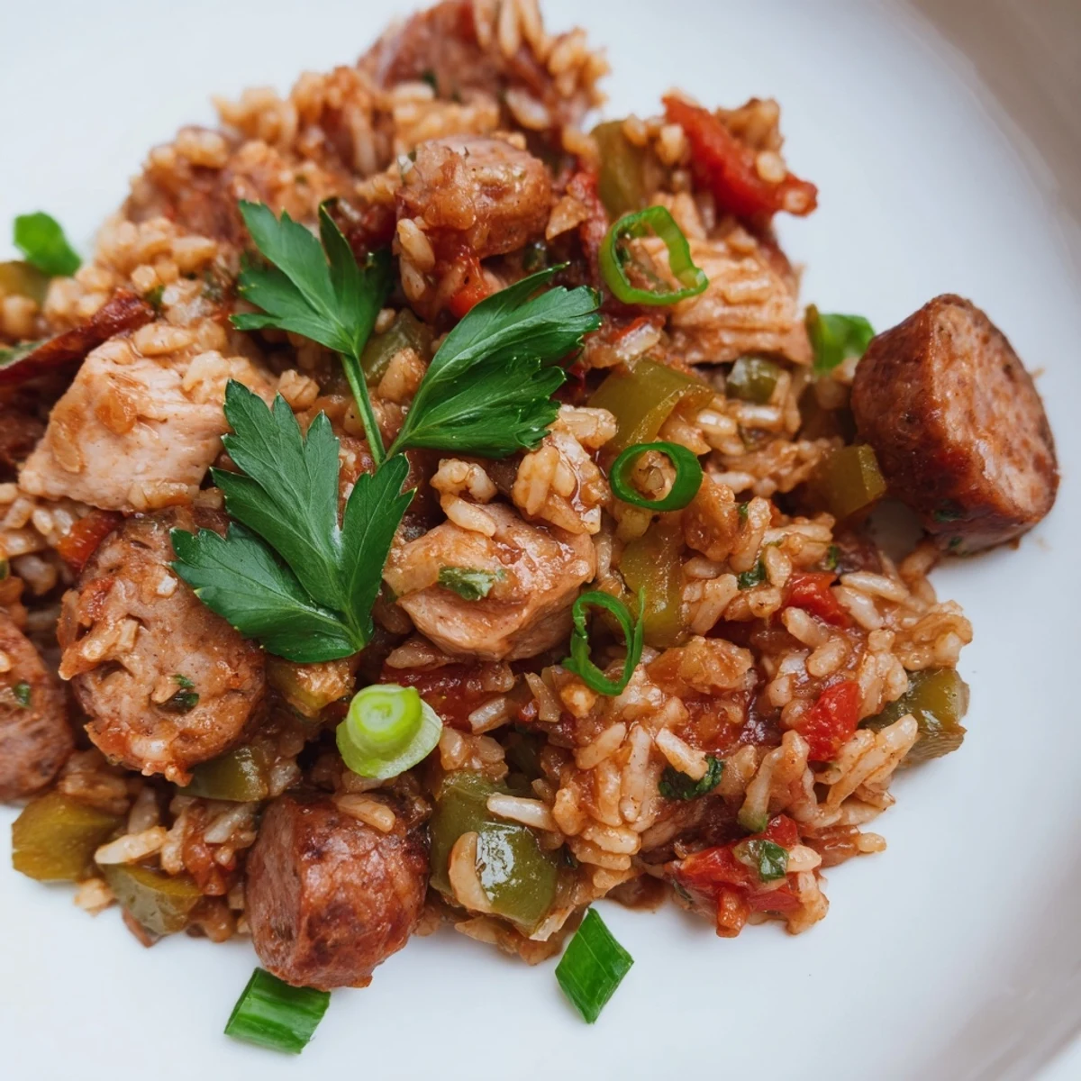 This vibrant Creole one-pot delight combines tender chicken thighs and smoky beef sausage with a medley of aromatics including onion, bell pepper, celery, garlic, and jalapeño. Blended with diced tomatoes, fragrant spices like paprika, thyme, and cayenne, and simmered with long-grain rice in rich chicken broth, this dish offers deep, complex flavors. Finished with fresh parsley and spring onions, it's a satisfying meal that embodies Louisiana cooking traditions.